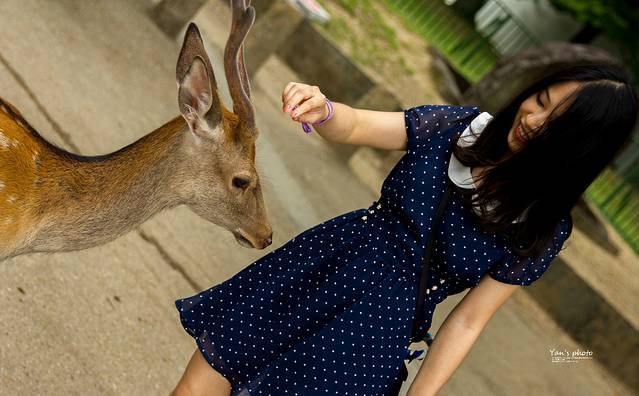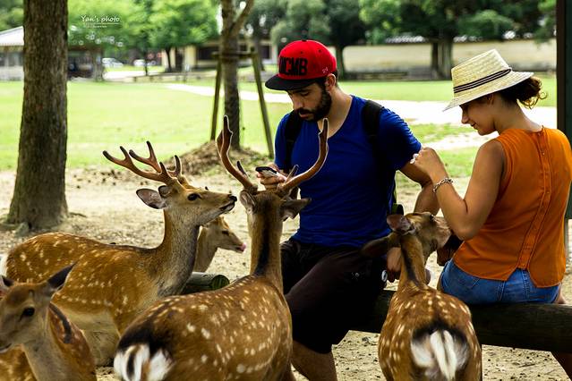 奈良公园里的鹿都是散养的,在路边溜达,如果你有鹿仙贝,他们会很快围过来,跟人很亲密。不要把吃的那在手上,他们虽然不攻击人,但是会抢你手上的食物哦~