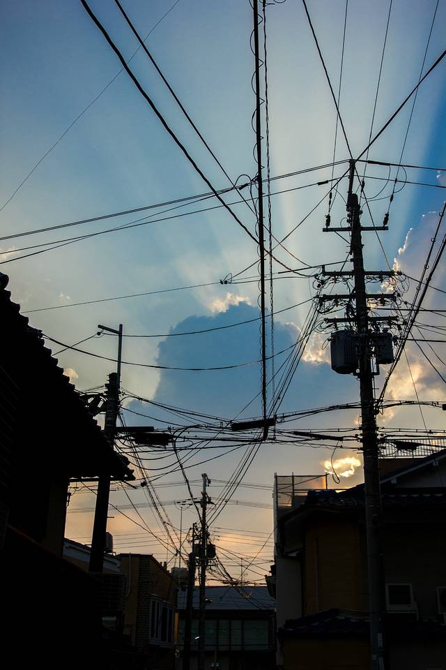 初到京都是一个夏日的午后,等我们找到民宿安顿好行李后已经是傍晚。傍晚的京都没有丝毫的凉意,站在错综复杂的石板路上看天,跟房子一样复杂的是这些电线。来日本旅游的游客可能会注意到日本天空中有大量的高压电线。不管是在郊区,还是在市中心,甚至在农村地区,当你抬头看天空或者遥望远处时总会看到这些厚黑的电线。