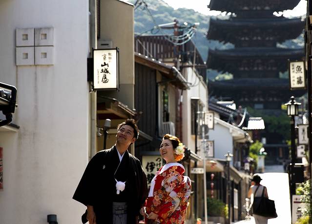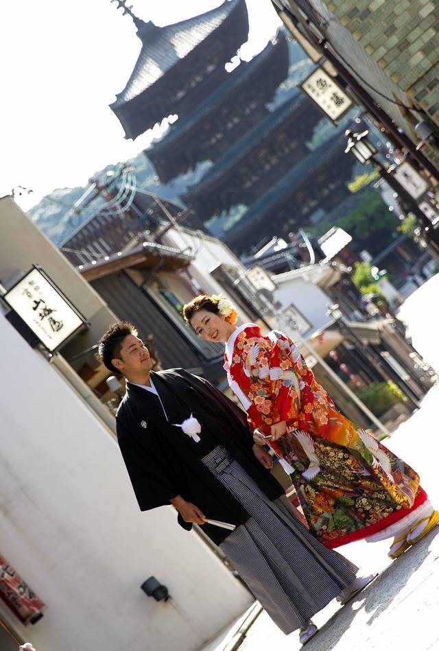 我们在京都住的民宿就在清水寺附近,清晨走在路上看到了一对正在拍婚纱照的新人,这对新人穿着传统的婚庆礼服,大方端庄。估计这应该和在中国拍旗袍类的婚纱照性质是一样的吧。