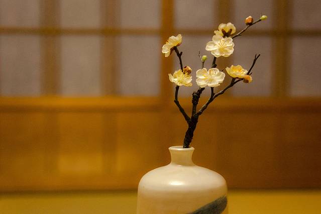 我们住的民宿的一景,榻榻米结构的屋子,日式和风的花瓶中的一支樱花。
