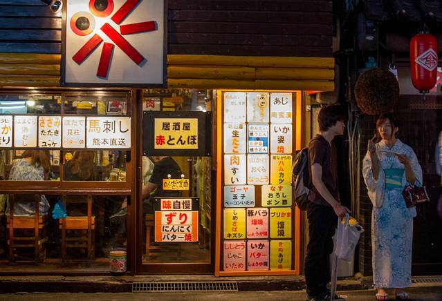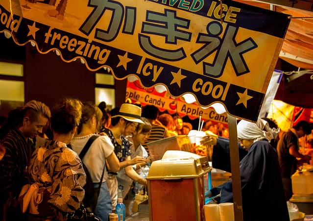 参加大阪淀川烟火大会的情侣,身着夏日的浴衣在买刨冰。一个大大的“冰”字,很有动画片中的感觉。