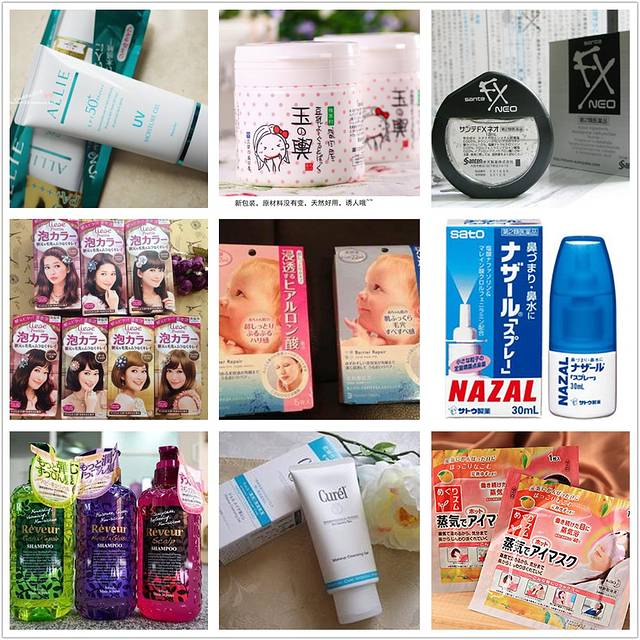 1、嘉娜宝防晒 2、豆腐面膜 3、FX去红血丝眼药水 4、花王泡沫染发 5、高丝面膜 6、鼻炎药水,真的超级好用 7、Reveur无硅油洗发水,配合护发素一起用 8、敏感肌卸妆蜜 9、花王蒸汽眼罩