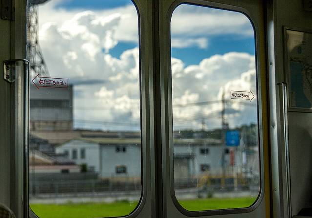 在JR里看日本,绿油油麦田、简单低矮的小楼、横架在电线杆上的电线、繁复交错的铁轨、层层叠叠的云朵、湛蓝的天,若是春季来,风一吹飘落的樱花,俨然一幅秒速五厘米的画面。
