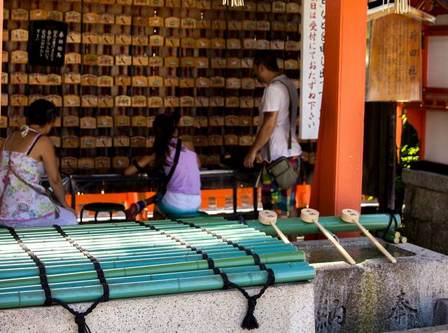 从京都城区到伏见稻荷大社最方便是坐巴士从清水寺到京都站,然后花140坐奈良线两站到。伏见稻荷大社的香火据说是最为旺盛的。稻荷神就是狐狸神,被认为保佑五谷丰收。