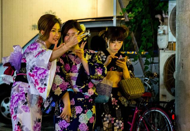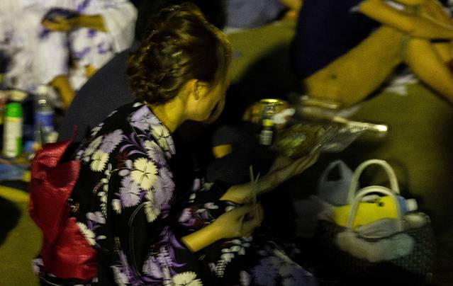 观看烟火大会时,一般穿着日本传统的浴衣。相对一般和服的昂贵和复杂,浴衣简单而色彩清丽,深受年轻人的喜爱,是夏日烟火大会不可或缺的装扮。