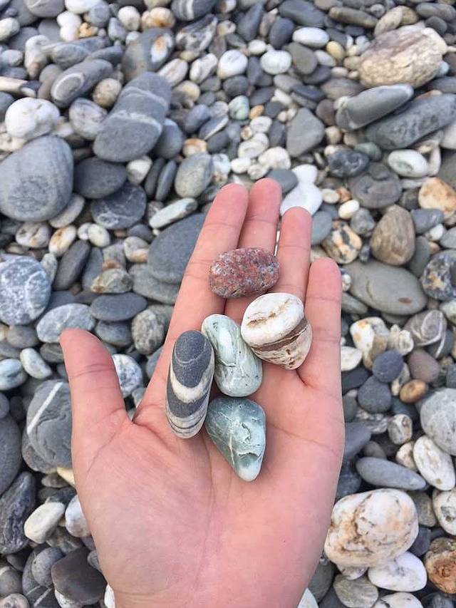 七星潭除了深蓝的海水,岸上的石头经过海水的冲刷早已形成了画纹不一,形状不一的美丽石头,每一块都很美,不允许带走,也不想带走,这里属于它们,它们也属于这里