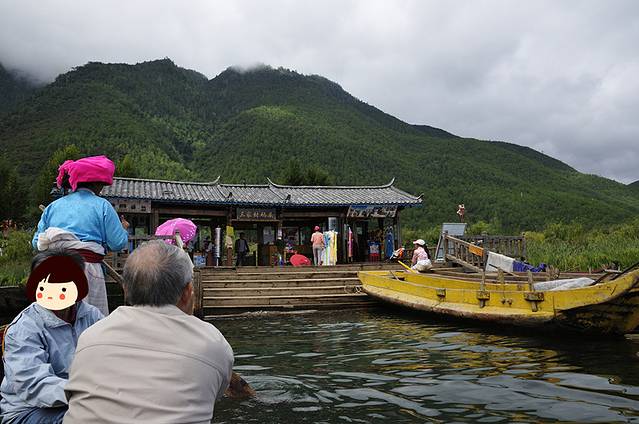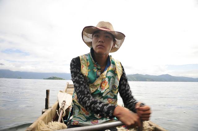 这船需要由两人掌握,船头是这位小伙子在用力,而船尾是他的妈妈掌握方向。大家对泸沽湖女儿国都非常好奇,便悄悄地问了下这位小伙子和他的妈妈。摩梭族是母系社会,基本大家族是由祖母掌权,就如我们今天划船的船费,并不是收入自己的口袋,而是要上交给村长,到月底再统一结算分配。而有权的祖母则会分配给每人,在家族绝对是德高望重的。据说喝了泸沽湖的水就会怀孕哦,哈哈。