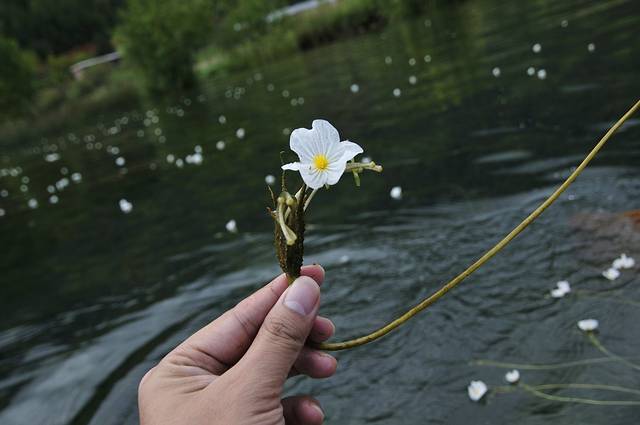 来张近景,就是它了,洁白的花朵。水性杨花是一种喜阳的植物,当太阳光照射时,便浮出水面,而天阴了则会缩回水中。所以当早上刚起来时湖面上并没有看到很多,越到正午,湖面上随处可见,太神奇了。 很多饭店都会用水性杨花 炒蛋作为一道菜,有兴趣的可以尝试下。