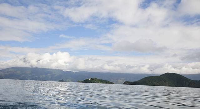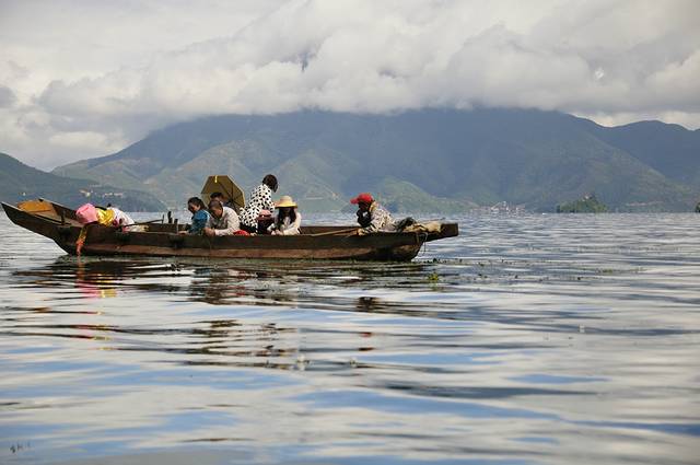 坐在船上,欣赏着蓝天白云,最远处被云雾环绕的就是最高的一座格姆女神山。格姆女神山是泸沽湖四周最高的一座峰,非常具有灵气。每年的转山节,摩梭人朝拜格姆女神,祈求一年的风调雨顺。如果想登上格姆女神山,可以从尼塞登上索道,站在最高点,欣赏泸沽湖全景。