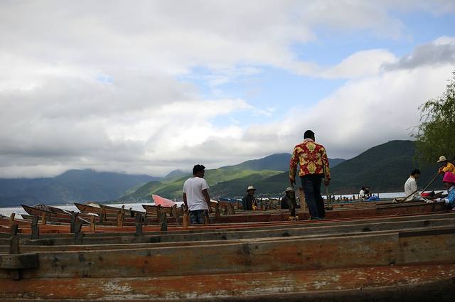 这时候已经临近6点了,眼前就是泸沽湖著名的猪槽船了,由一根圆木镂空,两头削尖制成。此时仍旧有游客上船欣赏,而我们决定第二天再划船,事实证明我们是非常明智的。在泸沽湖划船点很多,收费都是50元/人,但每一处的风景,划船时间都不一样。这就是司机杨师傅给我们的建议。