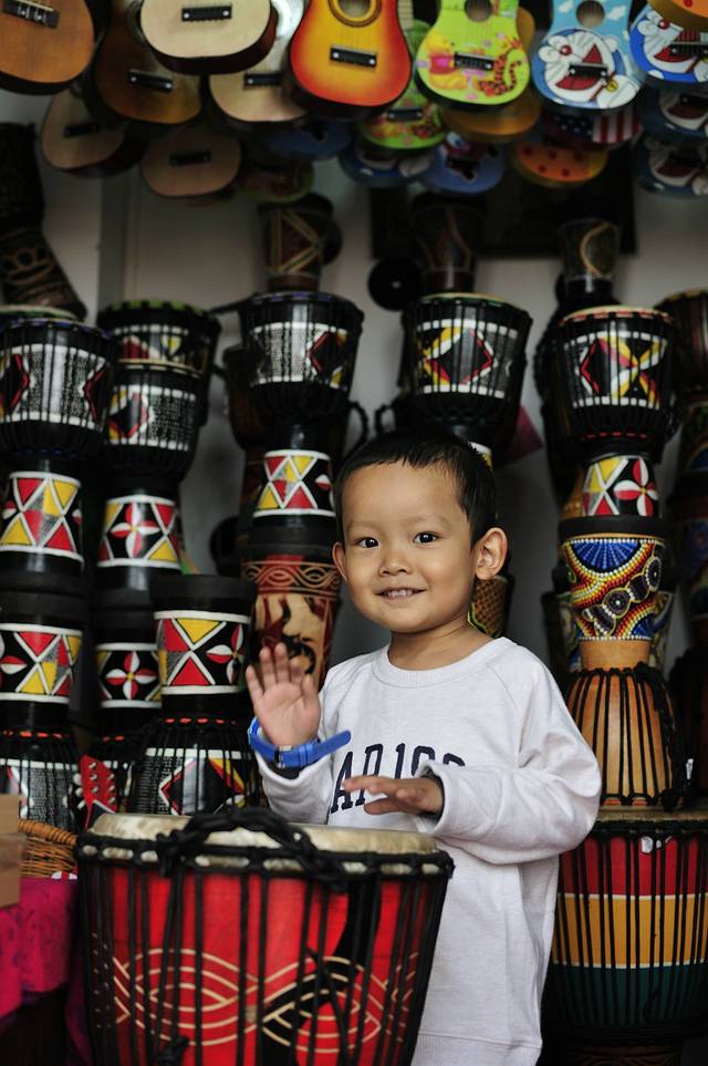 小朋友被羊皮鼓吸引到了,跟着卖家学拍起来。粑粑乘机咔嚓了一张。跟店家闲聊了几句,问一般几点关门,老板来句,想关就关... 任性极了
