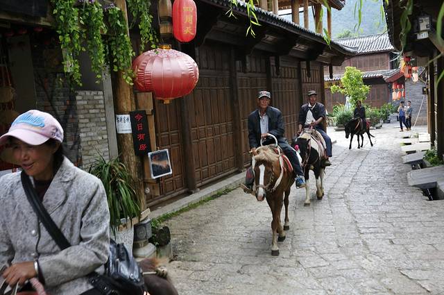 束河古镇还能看到一道风景,很多马夫行走于古镇上,小朋友迫不及待的想要骑马。最后谈下来一匹50元,我们要了两匹。就这样在古城晃荡了一圈。