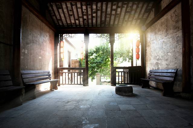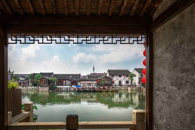 这是正对大门,有点像古戏台一样的临水大轩。朱漆圆柱,隔三开间,建筑主体深入湖中,这又似凉亭,四周临空突起的“美人靠”,(美人靠:美人靠靠美人,美人不靠靠不美。”据说最早的美人靠是吴王为了讨好美女西施而建的,后来此样式在江南一带的临河建筑中广为运用,美人靠也是“每人靠”,每个人都能靠,走累了就坐在美人靠,可以给游客歇息,也是小镇居民聚会拉家常的好地方)。