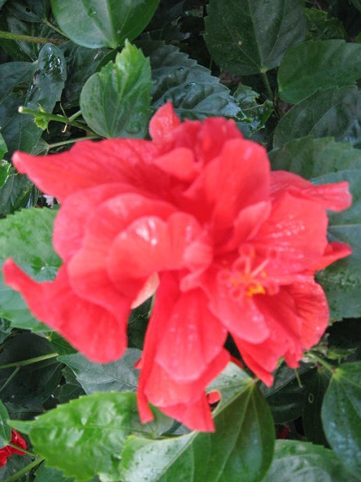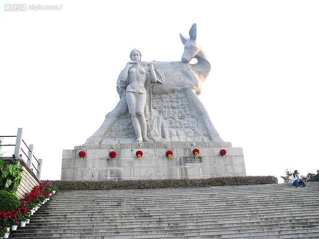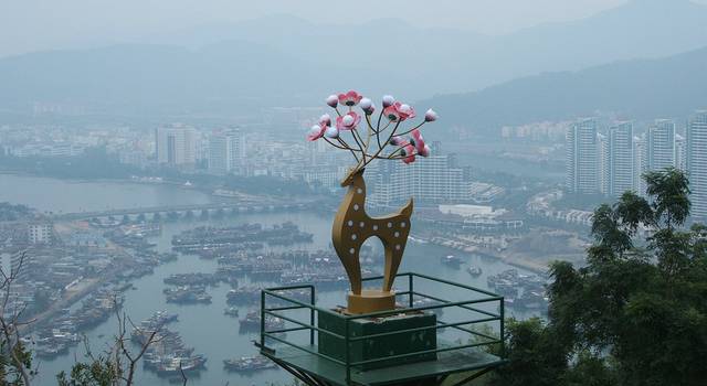 鹿回头”则是三亚南部的一坐高山,因一个美丽的故事而变得家喻户晓。传说,古代有一位黎族青年猎手,头束红巾,手持弓箭,从五指山追赶一只坡鹿,直到南海之滨。前面山巅悬崖之下便是茫茫大海,无路可走,猎手正弯腰搭箭,忽见火光一闪,烟雾腾空,坡鹿回过头变成一位美丽的黎族少女,并和青年猎手结为恩爱夫妻,他们在这片土地上,劈荆斩棘,搭起茅宿,耕种纺织,捕鱼狩猎,种植椰树,繁衍生息,天长日久形成这一黎家山寨。人们根据这个传说,便称山寨为“鹿回头”,三亚是也因此得名为“鹿城”。 “鹿回头”不仅浪漫多情,满目的热带雨林植被,也表明这里情如长青树,洋溢着生命的活力,是非同寻常的绿色世界。 沿着山路而上,到处可以看到一种非常娇艳的红花,薄薄的花瓣,很巧地折叠在一起,构成了一个美丽的图案。 这种红花叫做三角梅,是三亚的市花。 那带有几分紫气的红色里,渗透出一种叫做诱惑的花香。 三角梅遍布三亚各个地方,团团簇簇,到处都可以看到灿烂的笑容。 在山腰岩石突起的地方,有一簇三角梅,瀑布跌落下来一样的,悬挂在山石上,如火如霞,艳丽无比。上面,在一巨大的悬石壁前,一棵古树的盘根下,有一处巨大的石碑,上面刻写着四个血红的大字“海誓山盟”,字体苍劲有力,回味无穷。见此恸然,古往今来,多少缠绵凄切的爱情故事一一涌上心头。人常有海枯石烂之想,可能做到生死想依的又有几何?特别是在这个喧嚣今世,更是鲜见真淳之爱。在那古树裸露的根枝上,挂着无数把锁,各种各样的锁连成一溜,如悬挂着一道道深情厚意,甚为壮观。 多少期望幸福的青年男女,曾相伴来到这里,深情地挂上心底的那把锁,把钥匙丢进大海,期望永远和好。继续攀走,有一处小亭子,方方的,叫山盟亭,里面树有一块巨大的石碑,书写着“山盟碑”三个字,与“山盟海誓”那四个大字,交相辉映,让人感到这山上到处洋溢着浓浓的情爱。沿着绿色山径,来到山顶,迎是一座巨大的雕塑。这座巍然屹立的高12米,长9米,宽4.6米的巨石雕塑,是林献豪先生创作,1982年8月塑立的。塑像是一只神鹿转头回眸,一对黎族的青年男女分别依立在鹿前鹿后。黎族猎手健壮的体魄和不屈的神态体现了青年的勇敢和坚强,而黎族少女带有几分羞涩,几分柔情,微微低首,一片爱意在心。心怀这番情景,站在这山顶俯视三亚湾,联想这个鹿为媒的故事,不禁让人赞叹有这样美好的相遇,感叹由于这样的故事而使生活更完美,也让人对美好的爱情充满了无限的遐想。
