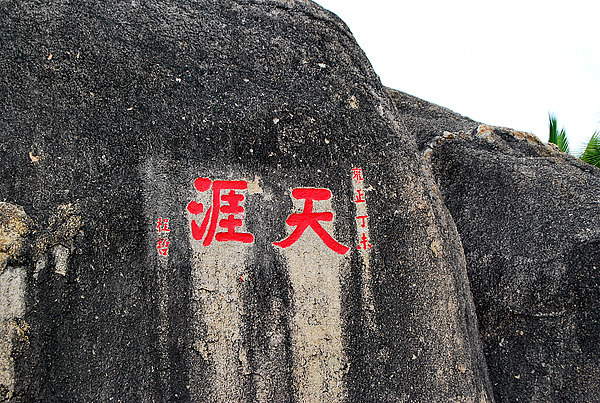 “天涯海角”位于三亚的天涯镇下马岭山脚下,山海相依,风景独特。 漫漫的金色海滩,直面祖国的南海,与碧海蓝天,椰树松林,构成了独特的景色。在延绵的沙滩海水间,疏密地散落着大大小小千姿百态的礁石,有的巨大,矗立在岸边,巍峨壮观,有的较小,出没在海里,偶尔在溅来的浪花里显露一下神色。各种奇特的礁石,让文人墨客联想不已,也创出了许多美好的情怀。沙滩上有一对拔地而起的青灰色巨大礁石,有十几米高,在那礁石的上方,分别刻写着“天涯”、“海角”字样,“天涯海角”就是由此得名的。 据说,“天涯”两字是清雍正11年(1732年)崖州知州程哲所刻。向东几百米,又有一尊高大兀立态如神笔直指九霄的圆锥型奇石,正面“南海一柱”四字遒劲传神,是清宣统年间崖州知州范云梯所书。这“天涯海角”和“南天一柱”都有一个动人的故事。传说,“天涯”、“海角”两块石崖本是一对痴情男女所变。古时内地有一男一女,自小青梅竹马,相亲相爱,长大后立下誓盟:生不能结为夫妻,死后即使变成石头也要并肩相立。谁知双方父母不许他们结成良缘,另择婚配。两人无奈,携手私奔,一直逃到海边。这时,追赶的家丁跟踪而至。面对浩瀚无垠波涛汹涌的南海,年轻恋人无处可逃,只好紧紧拥抱,双双投海。一帮家丁横冲过来分开了他们,此时风雨大作雷电闪鸣,两人立刻变成一对石崖,那些家丁也变成了他们中间的大小石尊。