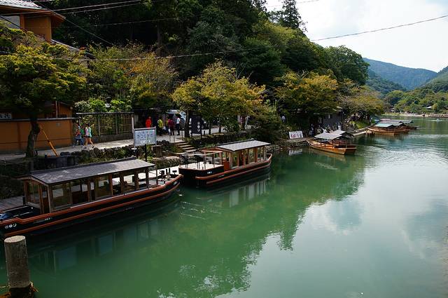 岚山:位于京都西郊的岚山,海拔382米,以春天的樱花和秋天的枫叶而闻名,东南不远处有桂离宫,是著名的观光胜地。过去的王公贵族经常在岚山脚下的大堰河轻舟荡漾,欣赏岚山四季的美丽景色。淡红娇嫩的樱花令人陶醉,艳丽如火的枫叶犹如悬挂的浮云。154米的渡月桥架设在保津川上,成为岚山的象征。大堰川绕岚山脚下潺潺流过,两岸山上松柏青葱茂密。山下竹林片片,一阵细雨过后,轻纱似的薄雾飘忽飘忽。