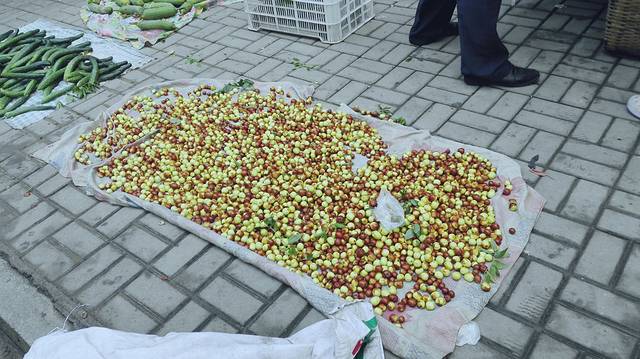 枣子是人家摊在地上卖的,很小的一颗,我尝了一下是酸的,里面的核还挺大,小伙伴说是野生的,应该是种在山里没人打理的野枣,所以发酸,最后还是没有买。又走了几家,最后买的是比较大的枣,小伙伴说是嫁接过的,有打理的,我不懂,反正是甜的,还挺好吃的,可惜的就是买的少了。
