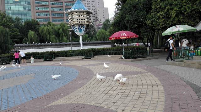 广场的右方的小广场上还有一堆白鸽 ,甚至直接把鸽窝就建在傍边,小孩们都在喂鸽子,由于都是小孩和大人,我就没好意思去啦,倒是饶有兴致的去看鸽子窝,要是这鸽子窝建在我家附近的话,早就被人抓了炖了,哪还需要喂呀。哈哈,看来济南人养护这个小东西确实也是花了不少心思的,主要还是要看人。