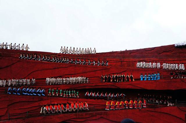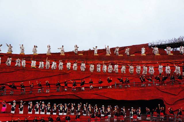 看台是露天的,逢雨就在雨中观看,工作人员考虑得很周到,每人进场时都拿有一件雨披,因为天阴沉着。即使朗朗晴日,人说丽江的天一山有四季、十里不同天,阴晴变化无定的。露天的看台以天穹作顶,气魄挺大。看台不像通常大型演出场地设置得那么豪华,那么精美,它完全照着自然的形貌勾勒舞台的形状。舞台层层递进,依次升高,在蓝天白云下蜿蜒,在丽江的土地上蜿蜒,中间一个阔大的场地,供演员集中演出。舞台给人的整体感觉就是真实的丽江土地,那红土高坡,坡形的