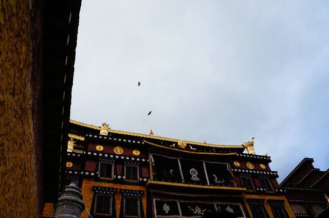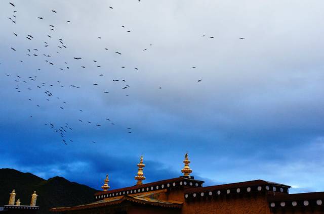 藏区是乌鸦的天堂,这里的食物任它们享用,这里的天空任它们翻飞,没有歧视,没有诅咒,藏区,一个属于它们的世外桃源。在香格里拉松赞林寺,这里的乌鸦是一种和秃鹫类似的神灵之鸟,它们是吉祥之鸟,是轮回之门上最初的使者,它们日常的叫声在当地人心里带着一种天堂和大地之间祥和的气息。它们是一群在海拔三千米以上,阳光升起不久之后,降临到松赞林寺大殿之颠,金光闪闪的经幢之上的乌鸦。(密集恐惧症慎入。。)