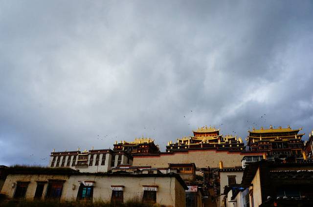 在这里能够远眺松赞林寺,阳光铺在金色的寺顶上,发出耀眼的金光。