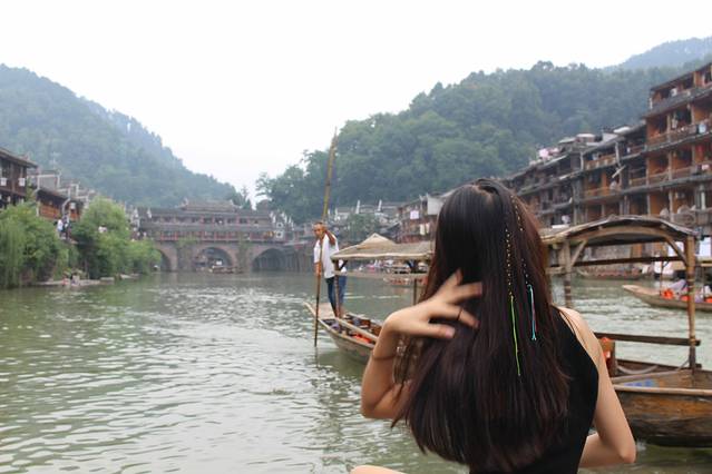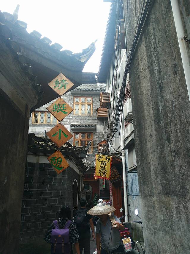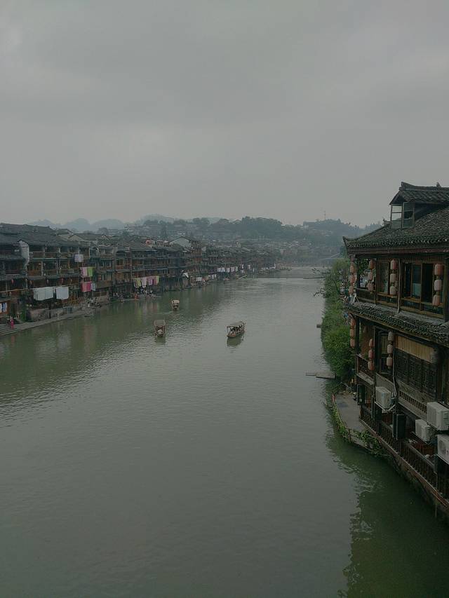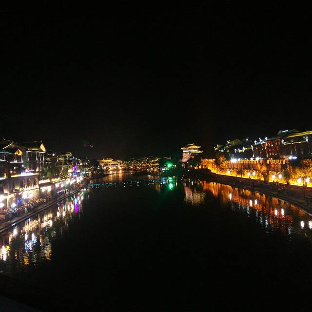 第二天早上自然醒来看了阅兵后就出去古镇逛了,白天看的也很漂亮,而且看得比较清晰,在买门票的时候可以免费领取地图,自己可以跟着地图走完全部景点,本来我以为古镇里面就只可以看沱江两边的建筑而已,那样算起来的话也不是很大,但后来发现不是,两边都有很多小入,进去之后是一些小巷子,都比较有色,有的插着国旗有些挂着大灯笼,可以买些纪念品也可以买东西吃,商业化气息较浓就不用说了,差不多每个被开发的景区都是这样,所以,自动忽略哈~~跟住地图走了个遍之后回到了古镇中间的那座大桥,具体名字不记得了,在那里组了一套民族服装(基本上入镇后有很多人上来兜你租衣服拍照什么,我们租了衣服就自己拍,10块钱一套哈),我们拍照时有好几个游客上来要跟我们合照哈哈,外国人也有。玩玩拍拍逛逛就差不多4,5点了,把服装归还后就坐在沱江边歇歇,黄昏时刻,我们就在江边坐着听着歌,还看见有当地妇女在沱江洗衣服,就是电视里拿着木棒一直敲衣服的那种,此时此刻真是超级无敌放松,很舒服很舒服,似乎什么烦恼都没有了,我词汇较缺乏描绘不出那种美好哈哈,所以就算了。晚上就去了江边的一间清吧,外面下起了毛毛细雨,里面歌手在唱着歌,烟雨凤凰飘摇自在的感觉也大抵是如此吧(心里千万丝懒死不走的念头啊哈)