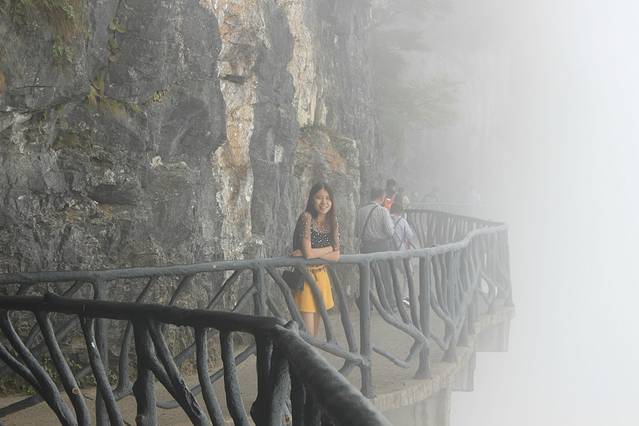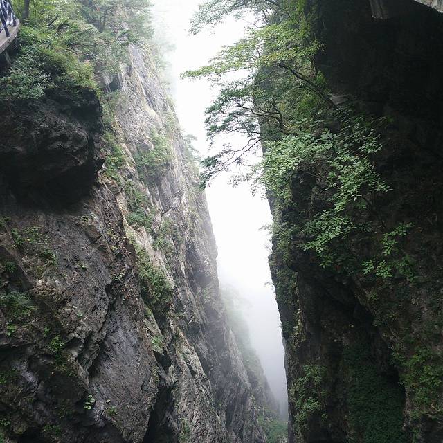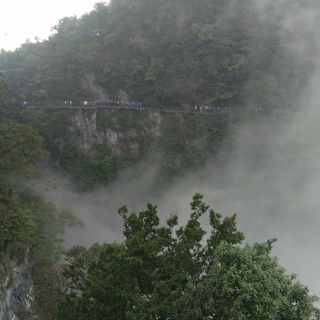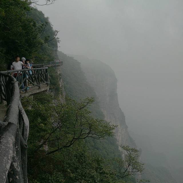 我们拿了个地图就开始出发了,自己看地图可以完全看懂,一个早上或者下午就可以把里面的景点逛完。里面路线分东西线,走完一条线可以继续走另一条线,最后搭乘跨度最大的电梯下山,到达天门洞就步行,有999级台阶,走下去就可以搭乘景区内的车免费到达出口也就是索道入口处,反正一路走就对了哈。这里提及一下天门山里我印象较深的景点,一个是鬼谷栈道,这个栈道紧靠山壁搭起,有一段路脚下好像没有实石垫着,就是一根根柱子撑着,整个栈道就像凌空在高空中,再加上周围烟雾弥漫,感觉很是奇特,途中也看到有几个人怕得要扶着山墙走。另外一个是玻璃栈道,个人走上去没什么感觉啊,虽然也是有不少人扶着走,我还是比较淡定,我的几个小伙伴也表示没有啥感觉,不过这的确是一个伟大工程,听说今年10月底又有一个玻璃桥道完工,这个更牛,是链接两个山,意思就是横跨两个山峰,一座桥直接架过去,到时可以去尝试尝试。其实里面还有好几个很出名的景点项目,不过这里不一一描述了,想知详细的可以百度。