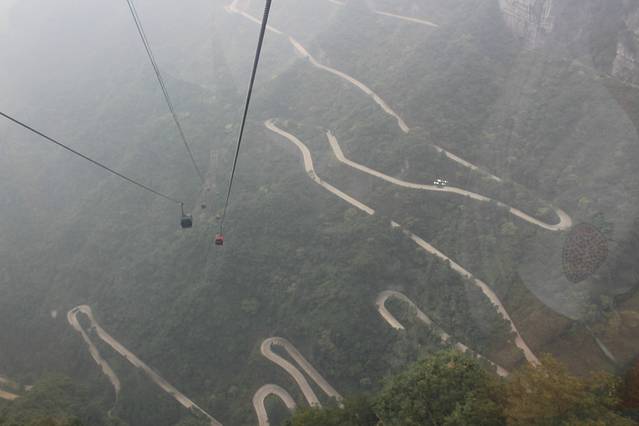 第二天一早8点半左右吃完早餐就出发去天门山了,索道入口就在马路对面,很近的。此处温馨提示,天门山门票可以提前一天在淘宝上购买,选择最多人付款的那家,可以比景点售票窗便宜40多块,第二天在门口的自动取票机取票就可以了,又不用排队,很方便,另外可以购买学生票,必须带齐学生证与身份证,查票很严,价格好像是正价票的一半。天门口门票已经包括了索道上山,另外里面有两个自费项目,就是玻璃栈道的5块钱鞋套费和缆车费(好像是15还是25块,就是只有几条铁圈起来的那种缆车,当时感觉好危险所以没坐哈)。坐索道缆车上山会看到天门山的那九十九道弯,俯视下去真的是颇为壮观,而且随高度升高,周围慢慢变得云雾弥漫,感觉像进了云端仙界一般,感觉很奇妙,全是白茫茫的一片,当时就心想还真的是值得一来。半小时后到达终点。下缆车后到达一个大厅,里面有地图拿,也有导游手机租借(押金100元,用完返回,可以说是免费使用),这手机用处就是一路上跟你解析这个景点的云云。