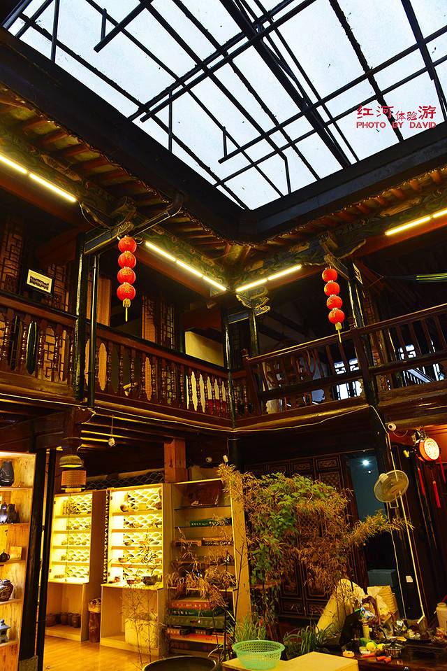 原先古建筑遗存下来的天井,被安装了透明顶棚后,既可以采光,又遮风挡雨,非常实用。后来发现建水古城中很多建筑都使用了这样的改造方式,把原先的天井作为了建筑物内可使用面积的一部分,蛮科学的。