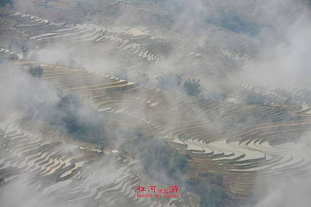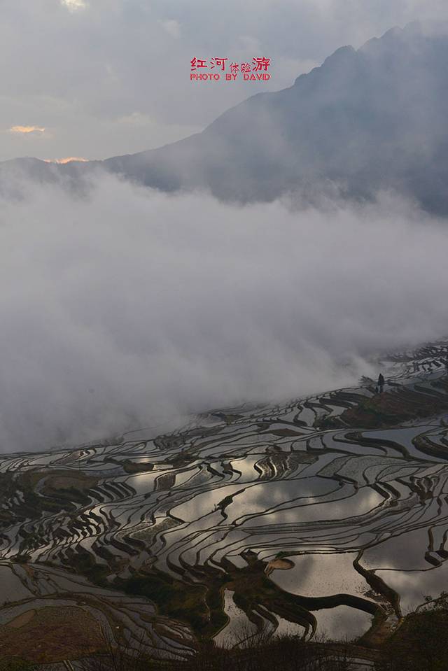 金乌藏身在云层里,偶尔泄漏出来的日光洒在浮云上,掩映出些许的朝霞,而这些再投射到梯田的水面上,中间是飘忽的云海,整个景色极为壮美。