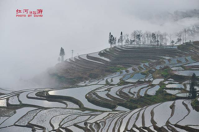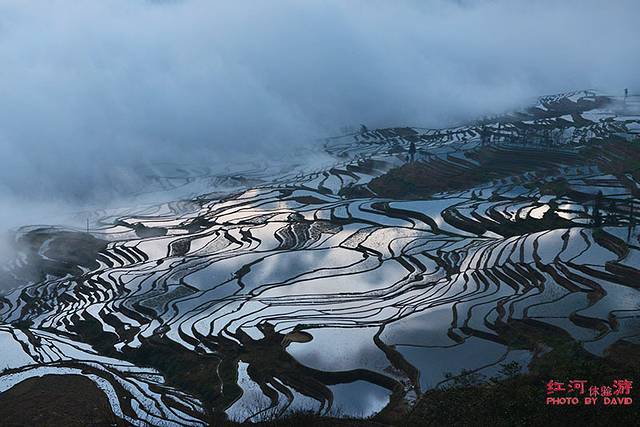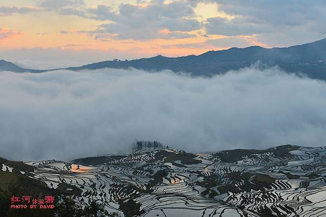 太阳还在地平线下,清晨的梯田宛如一幅水墨画,而晨雾云海给它增加了迷人的魅力。