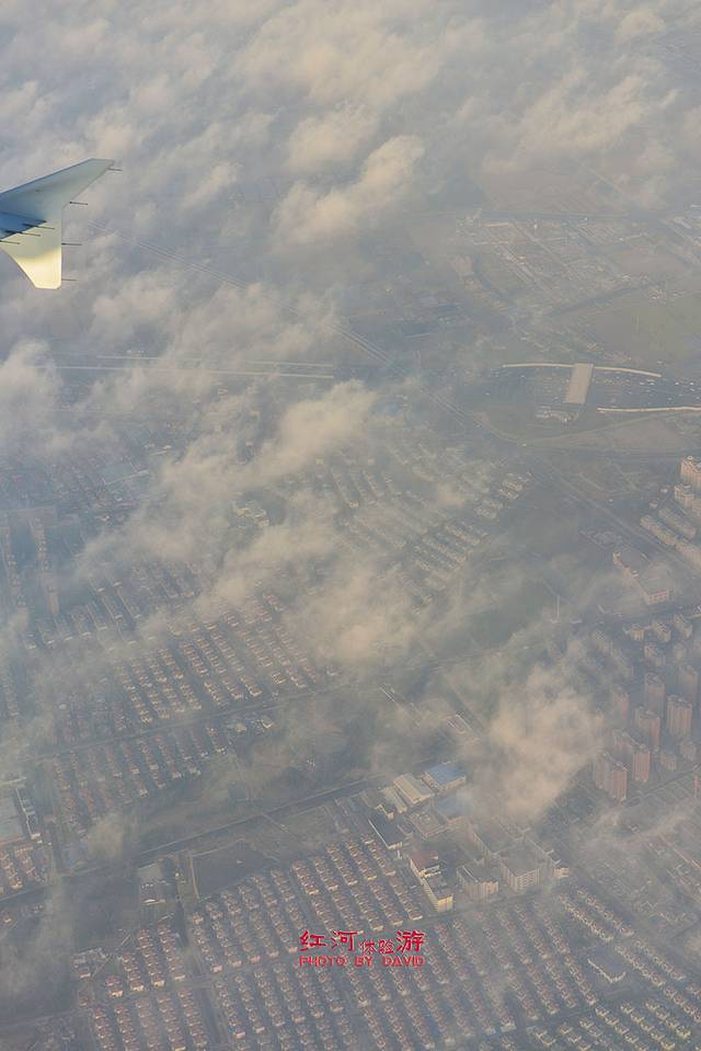 飞机起飞,机场周边的天气状况好过停机坪;但是在空中看到的魔都,空气的通透度还是很差的,心里自然向往起云贵高原上清冽纯净的空气了!