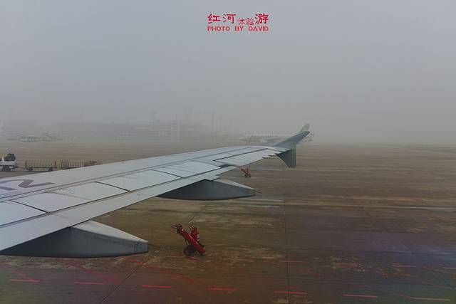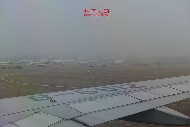 终于,在延误半小时后,我们的飞机开始滑行驶向跑道,而事实上,机场上空的浓雾一直没有散去,停机坪上大量的飞机都在若隐若现……