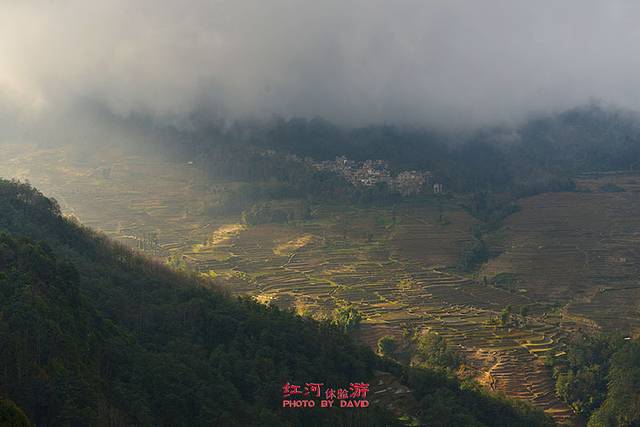 太阳吝啬地从云层的缝隙里洒落一点到梯田上,山谷里云雾缭绕,宛若仙境,相信这里的人们肯定可以长寿吧?