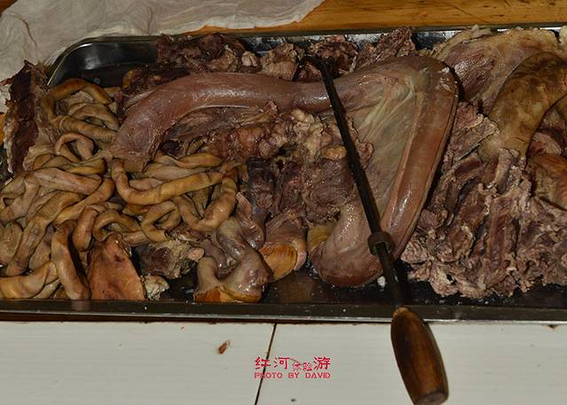 元阳牛肉的吃法,是预先煮好(因为牛肉现煮太费时间呢!),客人按照自己的所需,挑选牛肉、牛肠、牛肚、牛鞭,然后称好份量计费,每斤40元。接着大厨帮你切好,重新滚烫一下,配汤和蘸水上桌