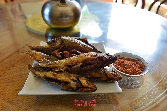 香炸梯田鱼,哈尼族的梯田就是一个完善的自然生态系统:梯田主要种植水稻,而在稻田里,养育和自然生长着鲫鱼、黄鳝、泥鳅等水生动物,水面上又散养着鸭子,黄牛……干炸的小鱼松脆香酥,蘸着干辣的蘸水料,美味得很。