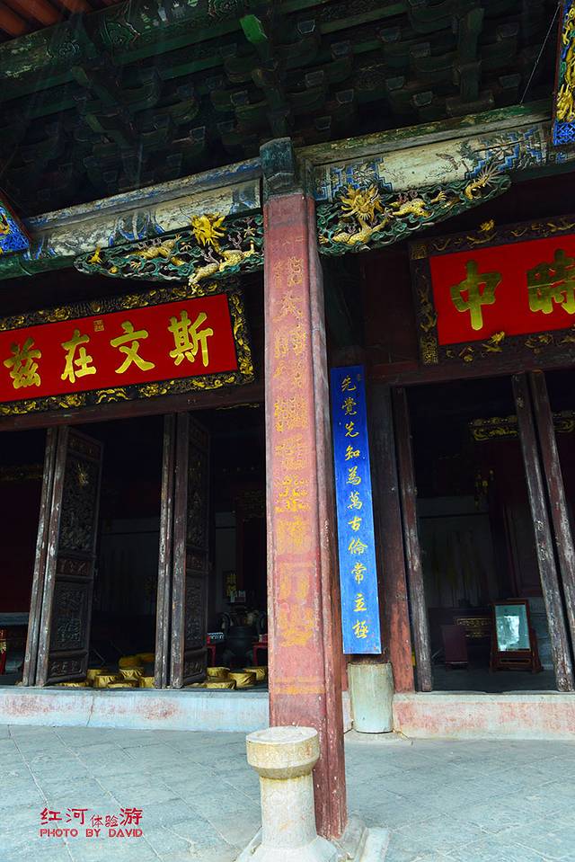 建水文庙目前开设两个门,朝南在临安路上的是正门,也是参观文庙的入口处。“太和元气”坊是文庙的单体大门,属四柱三楼三门道木牌坊,门头上的“太和元气”四个贴金大字,是赞美孔子思想如同天地生育万物。