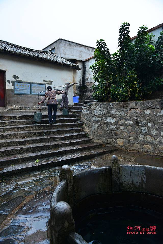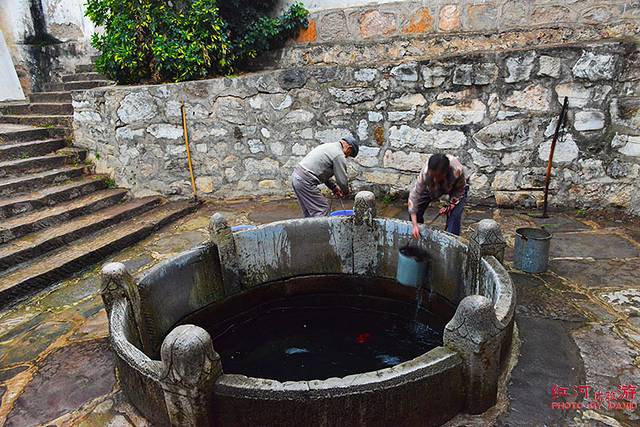 看到挑水的大伯大妈们,娴熟地从井里打上水,有的灌满纯净水桶后带回家,有的就直接挑着水桶回家。井水清冽,还有红色锦鲤在里面游泳呢……