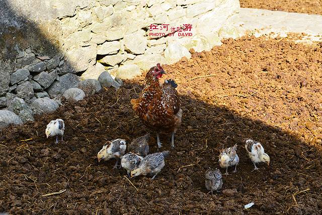 原来,不远处,它的妻儿正在一片地里翻着土找小虫子吃呢,安详闲适的农家场景啊。