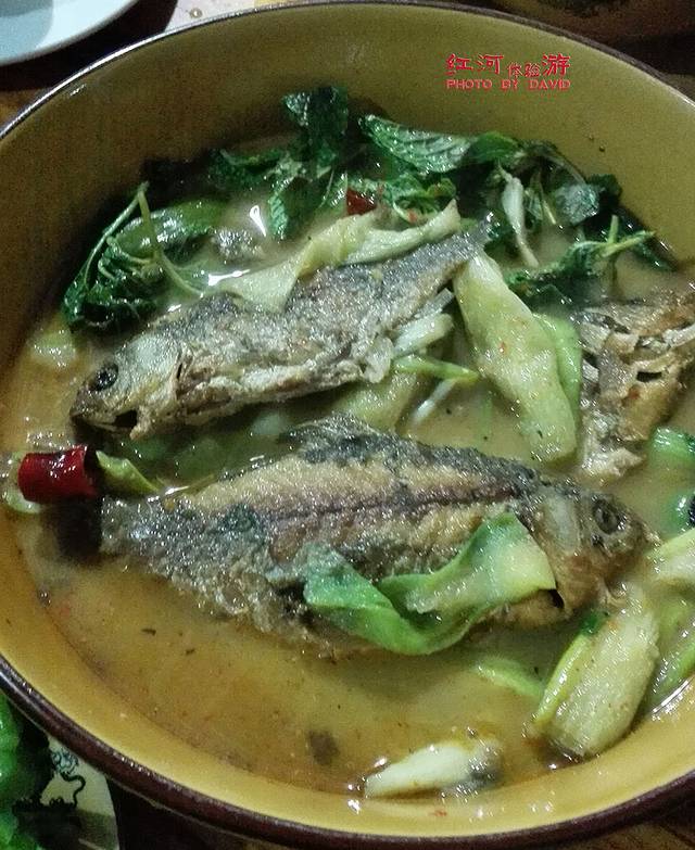 这是我最喜欢的一道菜肴,用哈尼族自制的豆豉(还记得刚才介绍过吧?)和芋杆一起炖的梯田鱼,出锅的时候撒上新鲜的薄荷叶,那个香啊……额,口水又上来了~~~