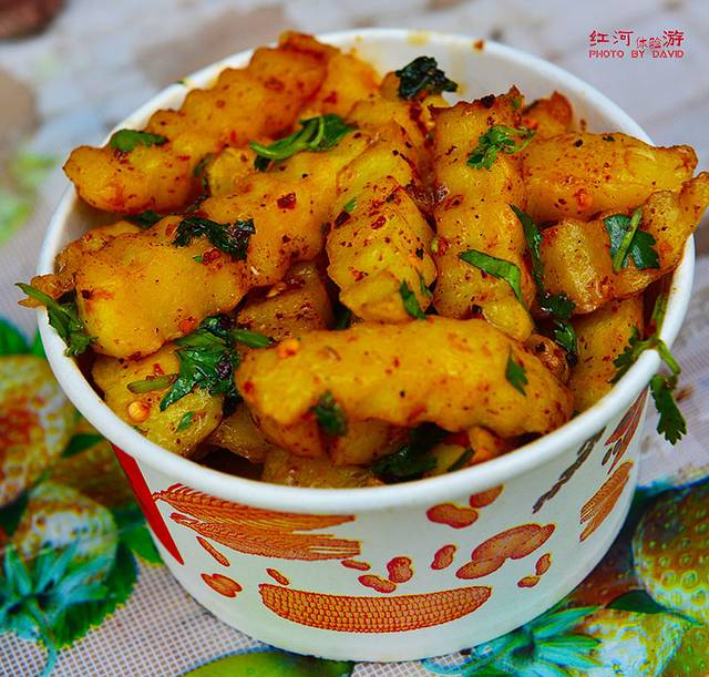 闲来无事就是吃!除了烤豆腐、咸鸭蛋,最好吃的就是这些土豆了。土豆切成条放在水里浸泡着,客人点了之后捞起放在油锅炸透,拌上辣椒香菜,口味咸香辛辣,本地的土豆本身甜甜的,很好吃!