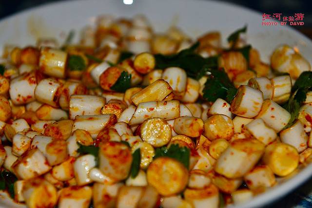草芽,是一种名贵的人工栽培的蔬菜,属香蒲科植物。其形状、颜色似小型象牙,又名“象牙菜”,唯云南建水所特有。草芽以幼嫩新生根状茎为食用部份。根状茎,圆柱形,顶部呈锥形,形态酷似象牙,故称草芽。草芽营养丰富,含多种氨基酸。我点的是凉拌草芽。