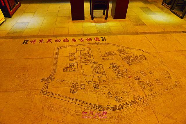 大堂的地砖上,镌刻着清末明初时的临安古镇地图,这些历史古建筑和街道都保护得很好,依旧是原生态的样子,让人看着就会不由自主地慢下步子,定下心来。