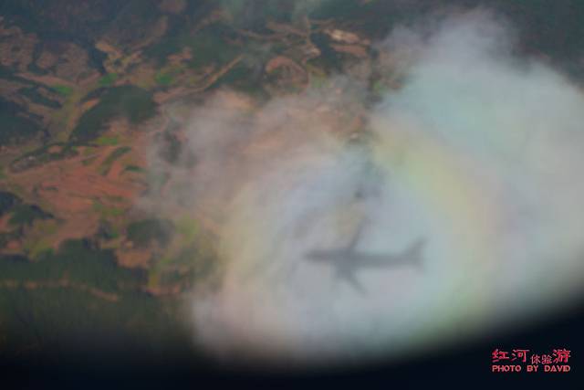 经过一阵颠簸,我们飞机从云层下降,而低空依旧有一些薄云,阳光把我们飞机的影像投射到白云上,给整个飞机戴上了美妙的“佛光”,可遇不可求的美景,看到的总要比能够拍下来的更加震撼和炫美。