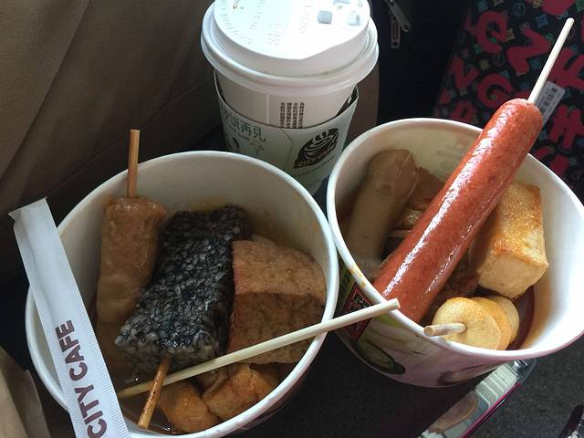 看到台铁便当了吗!!在台湾很有名,还有7-11的关东煮和水果~