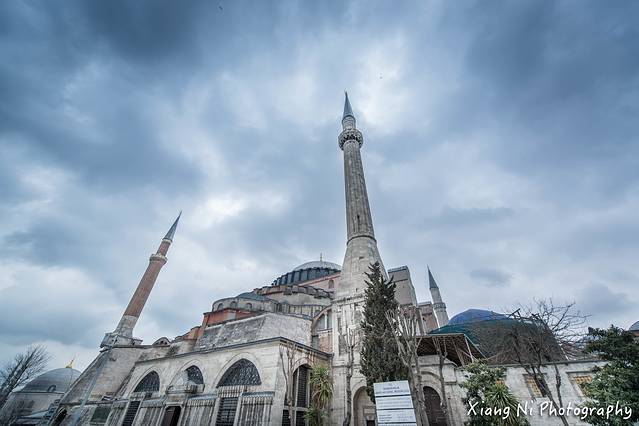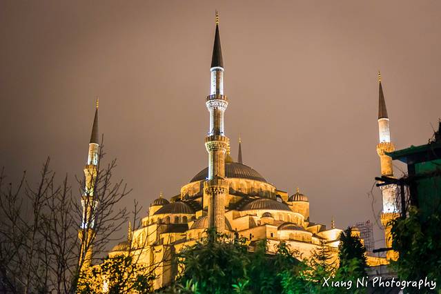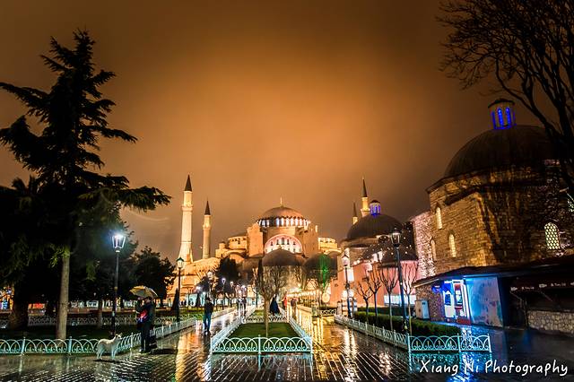 下午来到伊斯坦布尔,天空下着小雨,夜晚很快降临,笼罩着圣索菲亚大教堂~