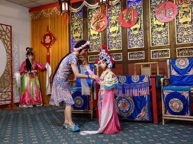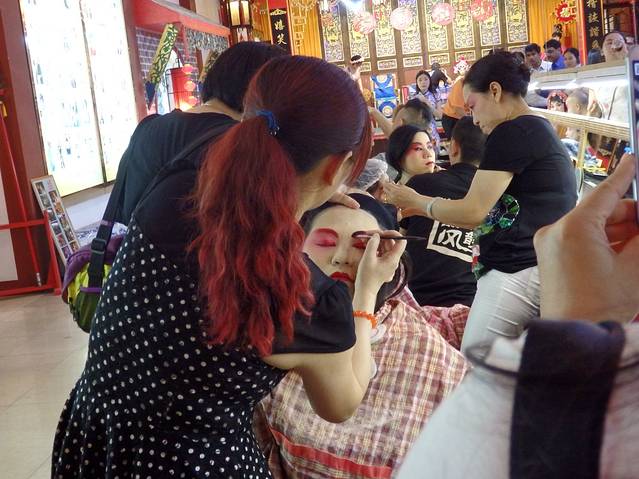 跑去他们戏台的化妆间参观去了。可以免费参观,也可以体验一下化上油彩,穿上戏服。川剧演员正在给小姑娘摆造型。美美哒!!!