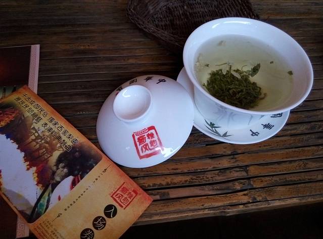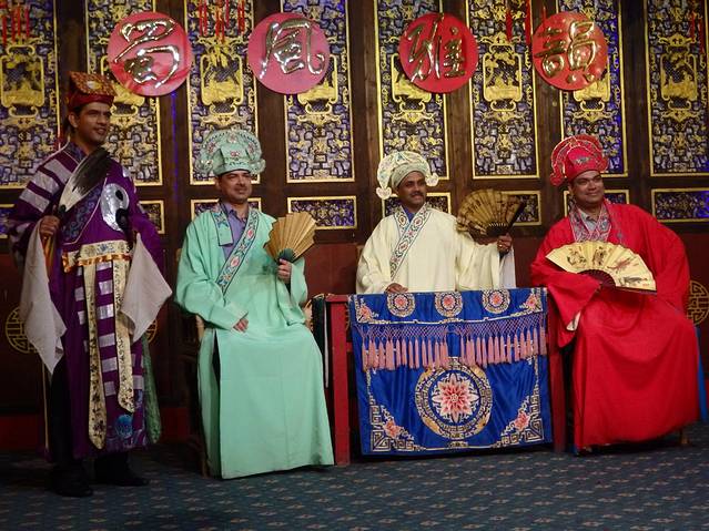 提前半个小时入场。找到票子上的位子,戏台里的服务员就给我们上茶了。