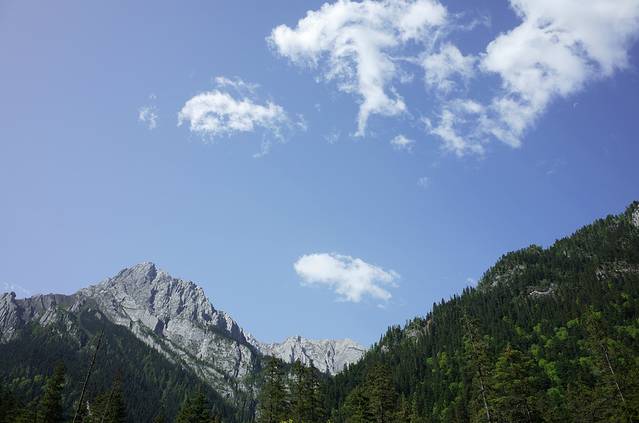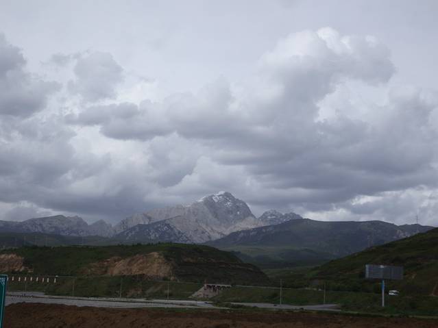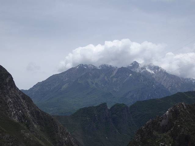 绕过一个山头,拍到了更近的雪山。云雾缭绕好像雪山的一顶帽子。