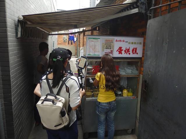 去吃了现做蛋烘糕。可以选择甜的口味或都咸的口味。我选的是菠萝口味的。外面有点焦焦的,里面吃很松软,再里面就是菠萝酱,甜甜的。